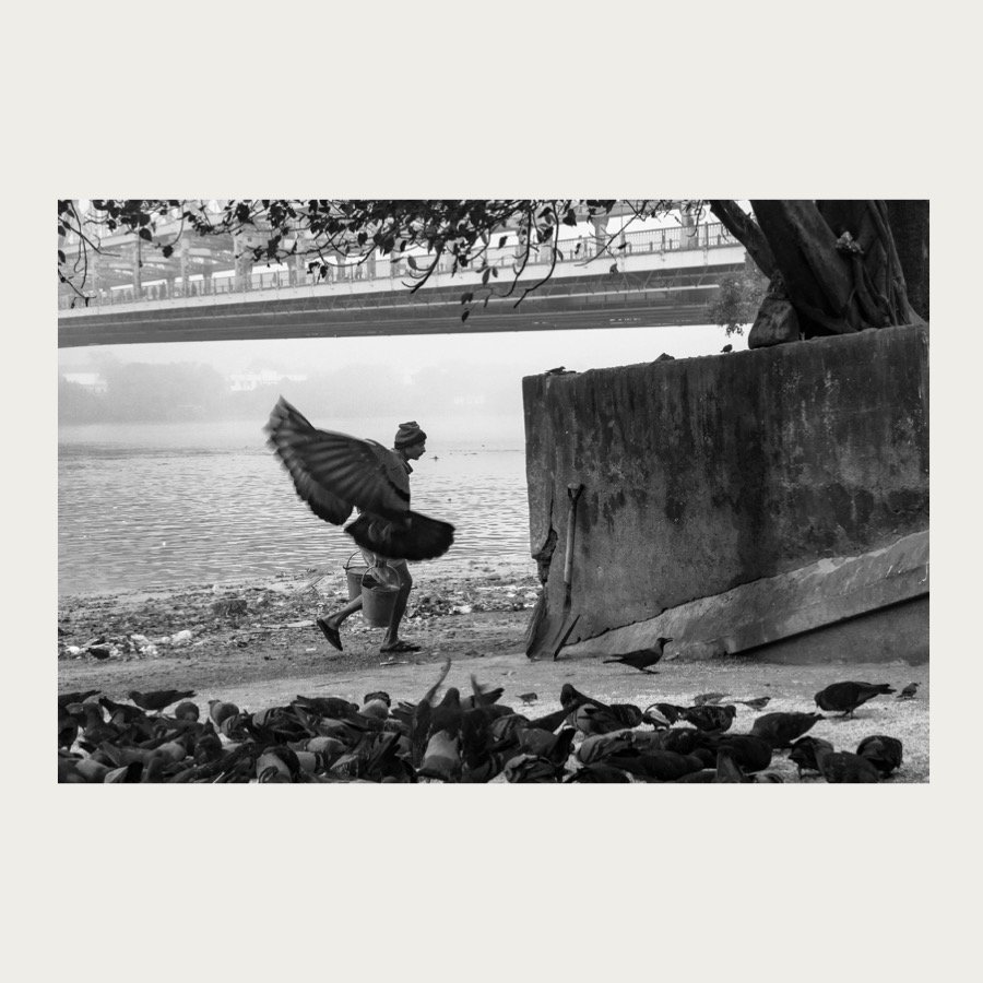 In this evocative image, a man walking beside the Ganges appears almost disguised as a pigeon, blending into their world as if to witness life from their perspective. The photograph reflects quiet observation, subtle transformation, and the delicate boundary between human presence and nature. Set in Kolkata, the image captures an atmospheric moment where identity dissolves into environment.