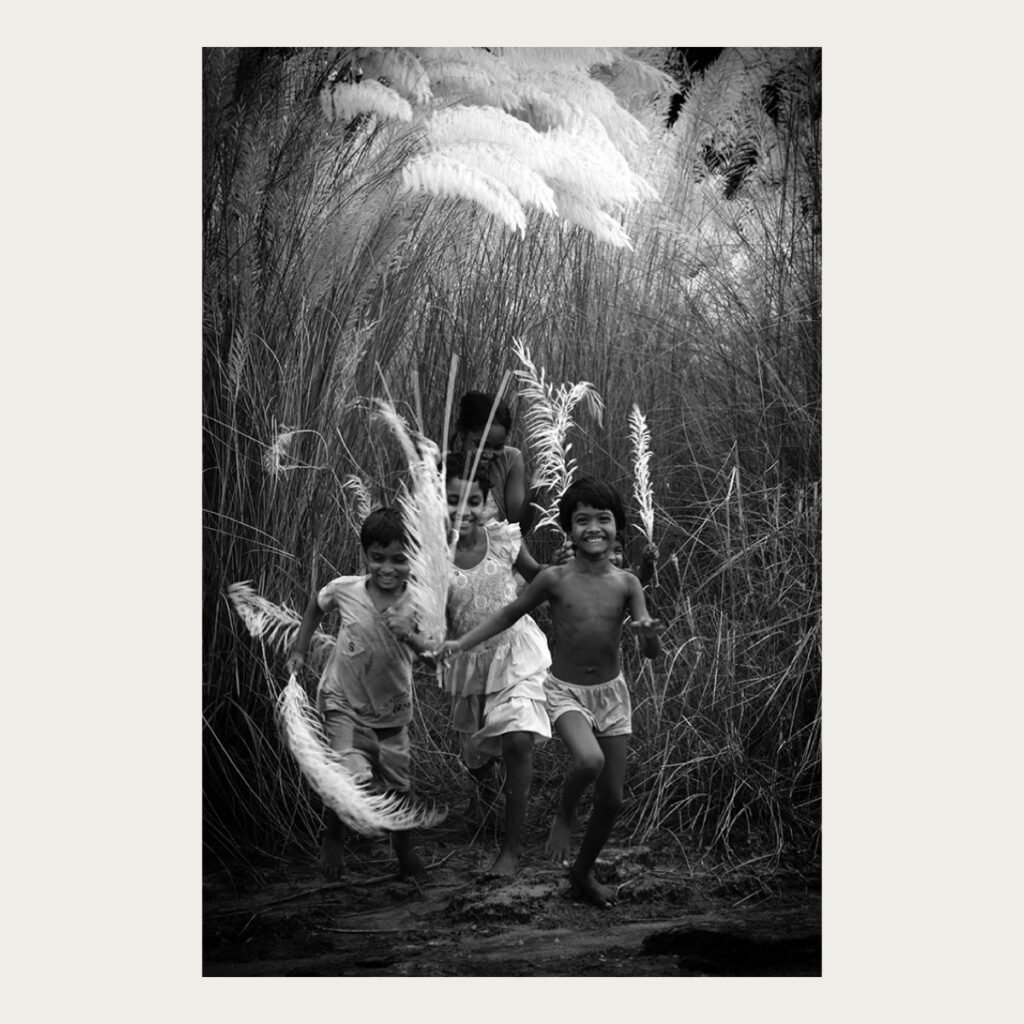Set amid tall kash grass in rural West Bengal, this photograph captures children at play within an open landscape. Shot in black and white, the image reflects freedom, movement, and the simplicity of shared space, grounded in everyday rural life by Bhaskar Kundu.