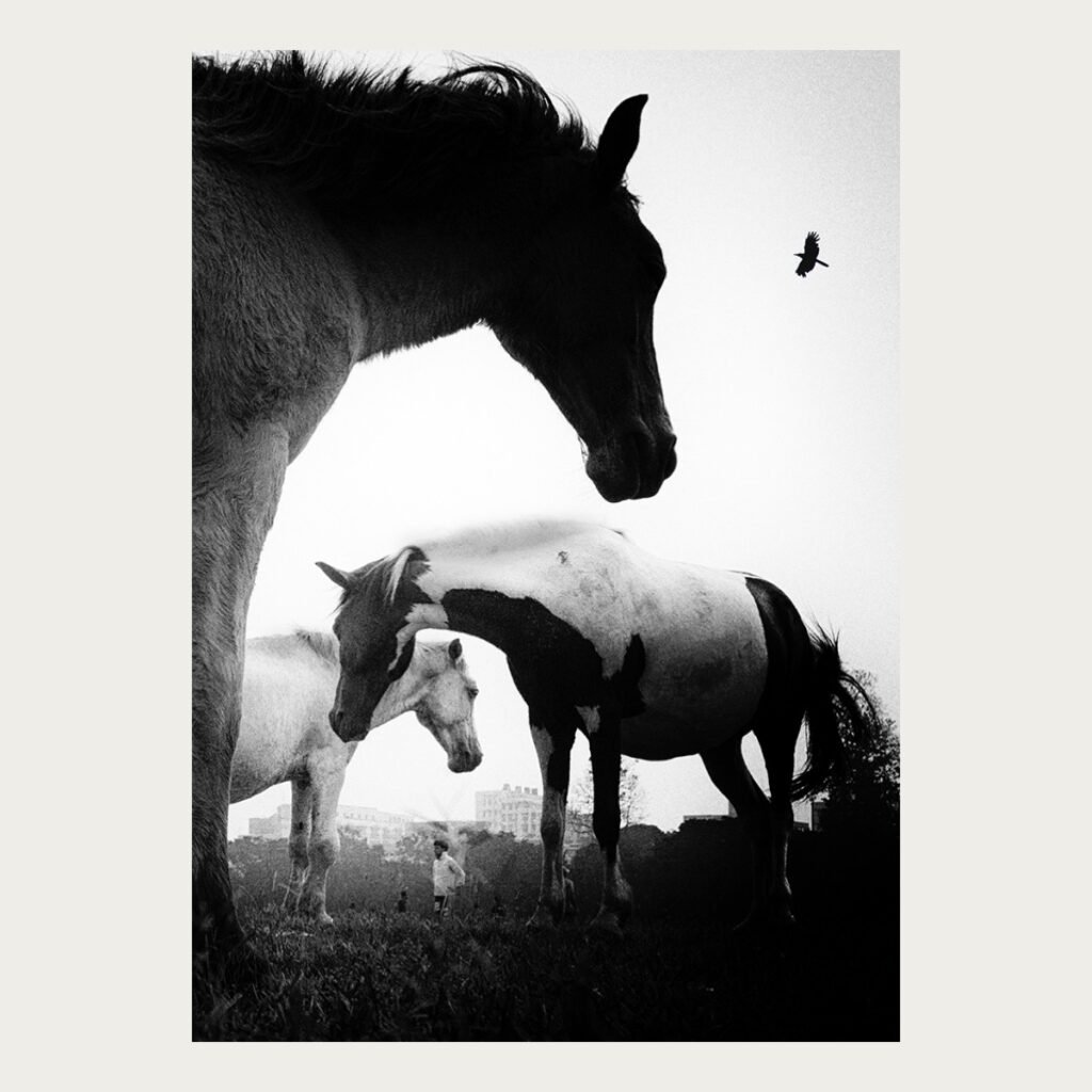 Captured at Kolkata Maidan, this low-angle black and white photograph presents horses and handlers against open space. The image balances scale and movement, offering a grounded observation of labour, presence, and environment by Bhaskar Kundu.